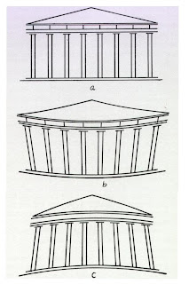La curvatura del estilóbato permite que las columnas no se construyan de forma exactamente paralela, sino que presenten una desviación de unos pocos grados hacia adentro, lo que corrige la ilusión óptica que crearía el que estas fuesen construidas de forma paralela (las veríamos combadas hacia afuera). En la Figura 2 puede verse en a) cómo vemos el Partenón; b) vista exagerada de cómo se construyó el edificio y c) vista exagerada de cómo se vería el edificio si hubiese construido tal y como lo vemos.